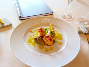 Stuffed artichokes with pan fried langoustine, artichoke coulis and maple lime syrup ©MRNY