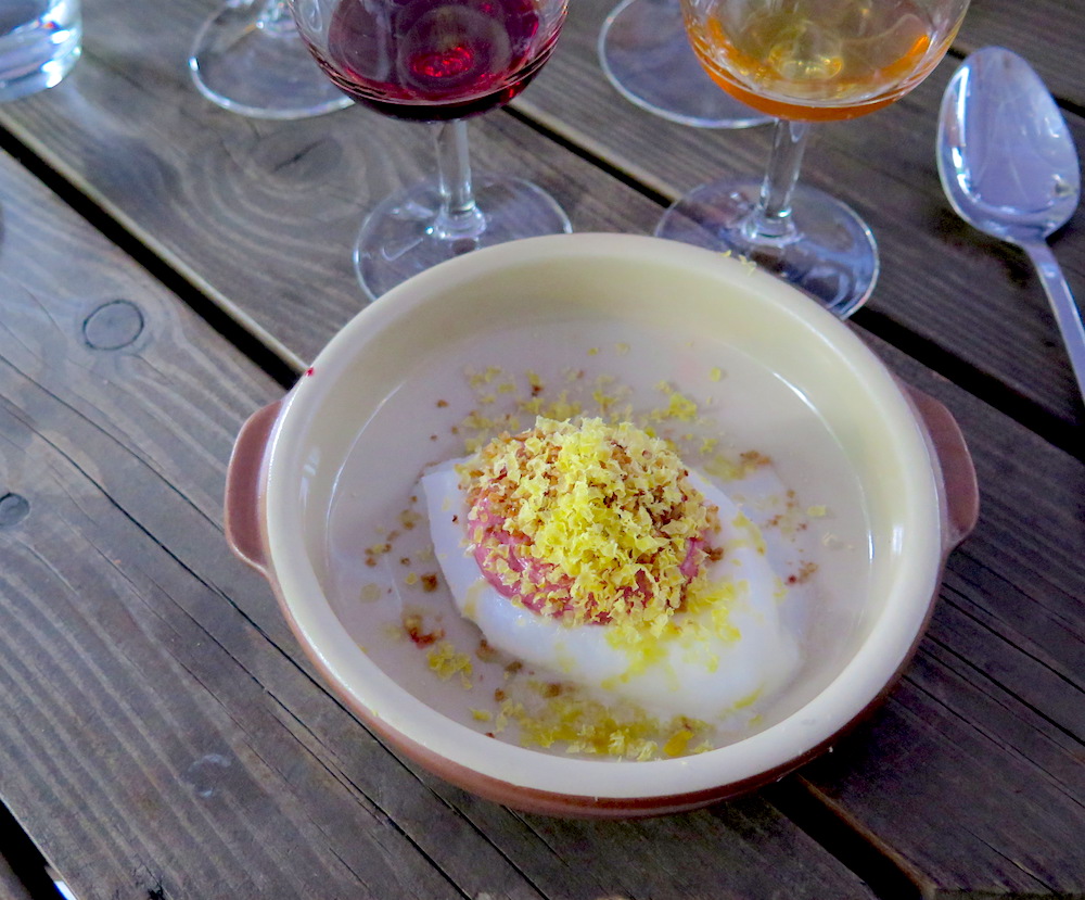 Dried egg yolk with cherry cream and yogurt sorbet at Leib Resto & Aed (photo by ©MRNY)