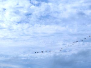 Pelicans fly in V-formation over South Beach (photo by ©MRNY)