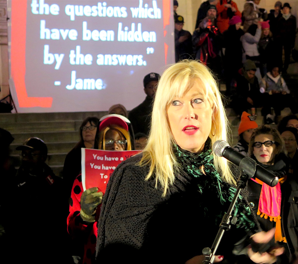 Justin Vivian Bond reads David Wojnarowicz at PEN America Writers Rising on the steps of the New York Public Library (photo by ©MRNY)
