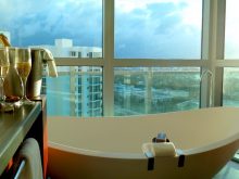 The truth is, there’s no better South Beach vista than the one from the balcony of an oceanfront hotel room: the sweep of the sand, the aqua-blue water, waves breaking along the shore as yogis practice asanas and runners jog along the waterfront-and waiters scurry to and fro, carrying drinks to those too relaxed to move from their cushioned chaises.
